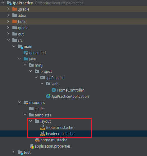 src/main/resources/templates 에 layout 디렉토리를 추가하여 모든 화면에 공통으로 적용할 header.mustache와 footer.mustache를 생성합니다.