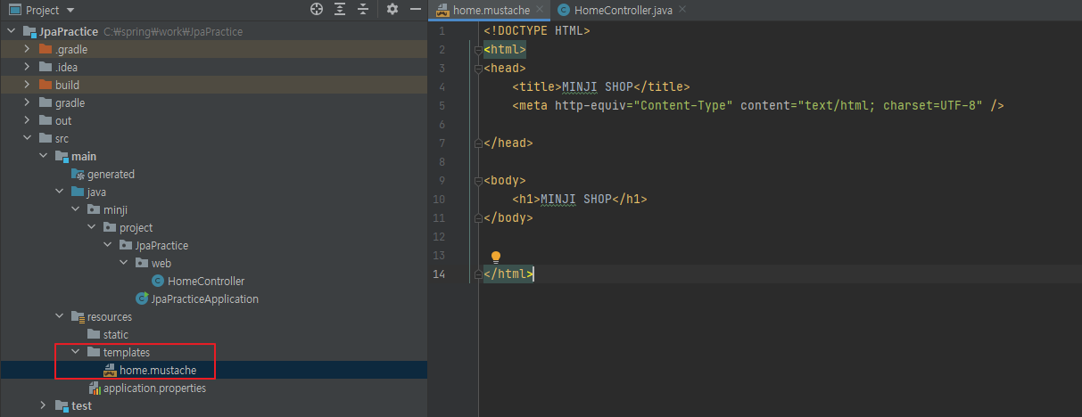 Mustache 파일의 기본 위치인 src/main/resources/templates 에 home.mustache 파일 생성