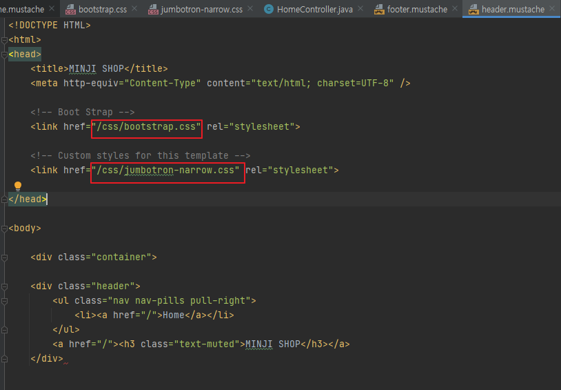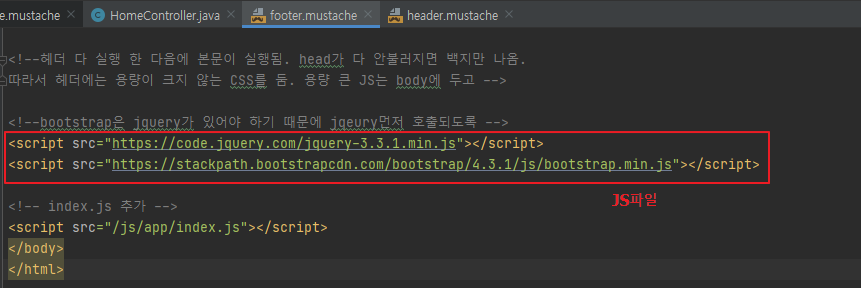 아래와 같이 home.mustache를 구성하기 위해, header와 footer mustache 파일을 수정했다.