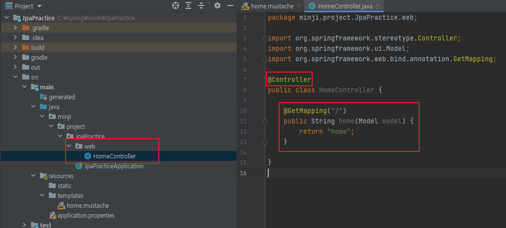 GetMapping으로 localhost:8080/이 왔을 시, home.mustache가 나오도록 한다.
