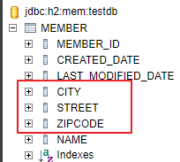 DB에보면 Member 테이블의 Address에 해당되는 city, street, zipcode 컬럼이 생성되었다.
