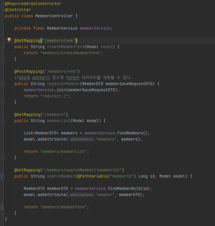 - DTO 클래스에 setter가 없으면 화면으로부터 값을 가지고오지 못한다.
