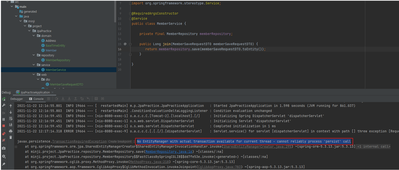 - @Transactional을 붙인다. 없으면 아래와 같은 에러가 난다.