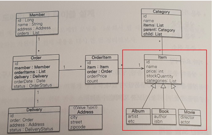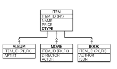 Entity에선 Item을 Album, Book, Movie가 상속받는다.