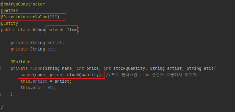 super로 부모 클래스인 Item 생성자를 호출하여, Item 필드의 값을 초기화한다.
