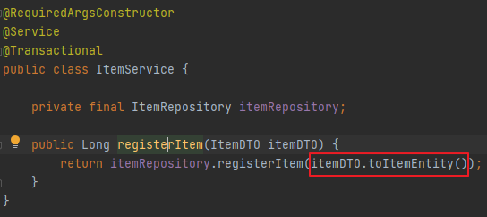 서비스에서 ItemDTO를 Entity로 변경하여 Repository에 넘겨준다.