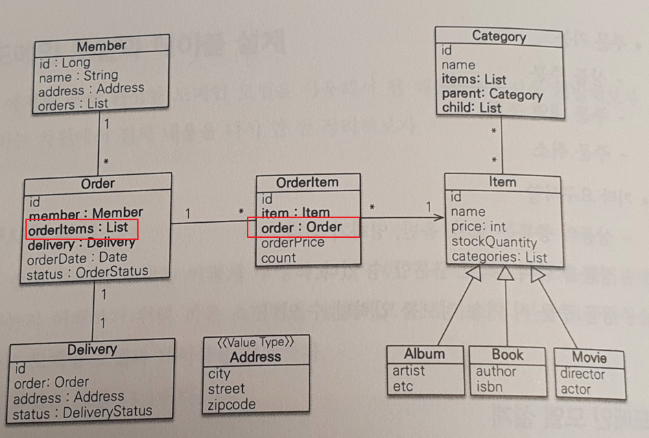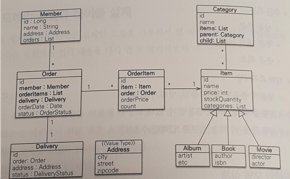 - 주문 정보(Order)에는 주문한 고객(Member), 배송 정보(Delivery), 주문한 상품 목록(OrderItem List)가 있다. 또한 주문 상태 (OrderStatus)와 주문 날짜(Date)도 있다.
