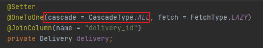 Order의 Delivery에도 Casecade 옵션이 있으므로, Order 삭제 시, 연관된 Delivery도 같이 삭제된다.