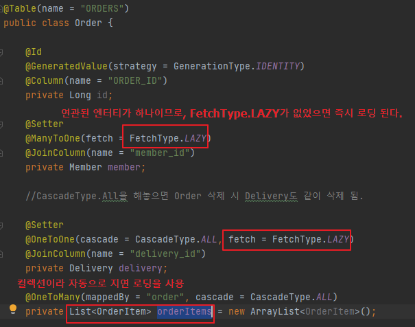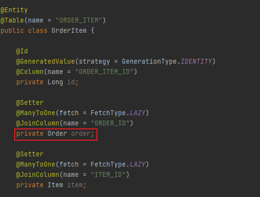 - 식별관계의 주인이 아니기 때문에, mappedBy로 연관 관계 주인인 OrderItem 내 Join 대상인 필드를 정해줘야 한다. OrderItem의 order 필드와 조인하므로, mappedBy에 order를 넣어준다.