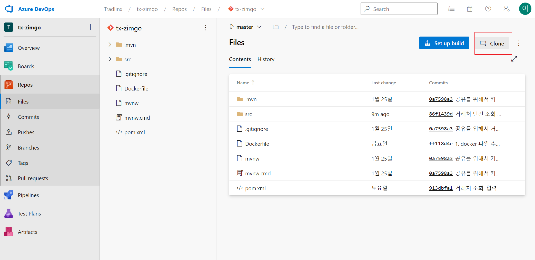 5. Azure DevOps의 Repos에서 Clone을 누른다.