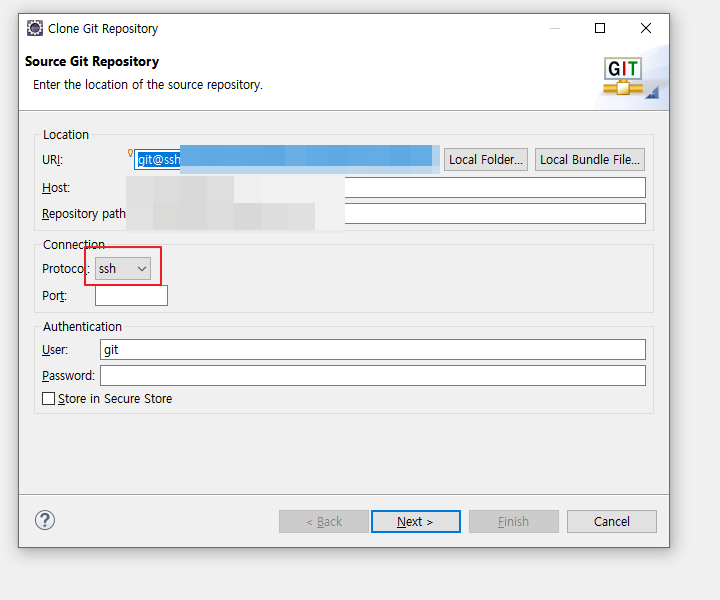6. IDE의 Git Repositories에서 SSH로 복사한 주소를 붙여넣고, 프로젝트를 받아온다.