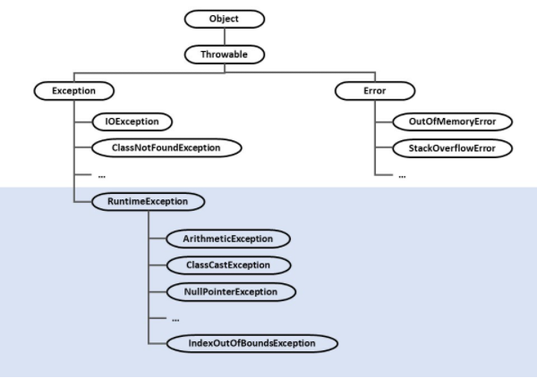 자바에서는 실행 시(runtime) 발생할 수 있는 프로그램 오류를 아래와 같이 두 가지로 구분한다.
