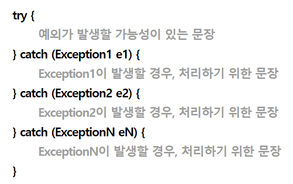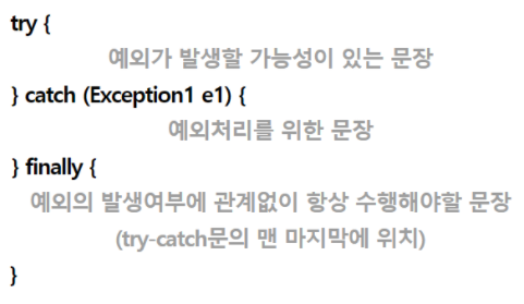 예외를 처리하기 위해서 try-catch문을 사용하며, 구조는 아래와 같다.