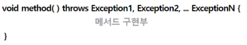 예외가 발생한 메서드에서 예외처리를 하지 않고 자신을 호출한 메서드에게 예외를 넘겨줄 수 있지만, 이것으로 예외가 처리된 것은 아니고 에외를 단순히 전달만 하는 것이다. 결국 어느 한 곳에서는 반드시 try-catch문으로 예외처리를 해주어야 한다.