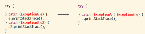 JDK1.7부터 여러 catch블력을 '|' 기호를 이용해서, 하나의 catch블럭으로 합칠 수 있게 되었으며, 이를 '멀티 catch블럭'이라고 한다.